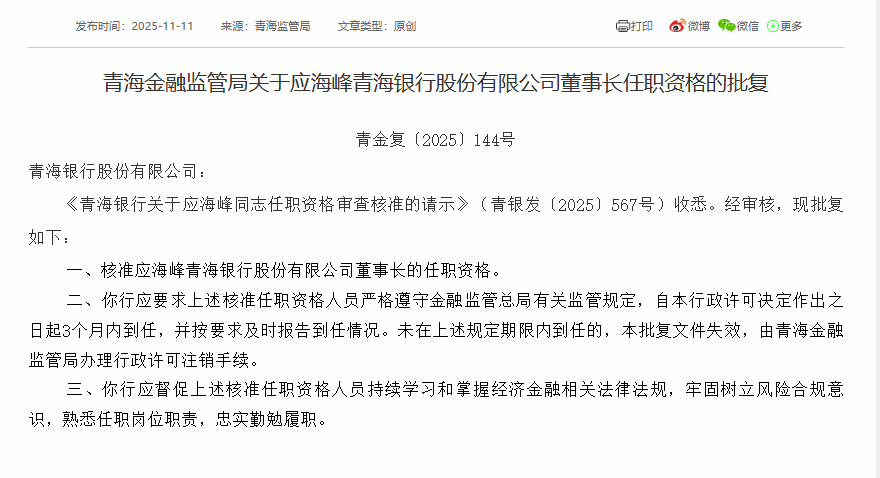 日前,国家金融监督管理总局青海监管局发布批复,核准应海峰青海银行股份有限公司董事长的任职资格,核准吴存寿青海银行股份有限公司行长的任职资格。