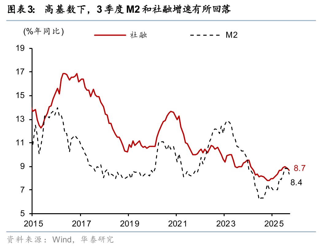 1.3季度广义货币量价齐降,金融条件保持宽松。从货币信贷“价”的角度看,3季度金融机构加权平均贷款利率(WALR)季环比回落5个基点至3.24%,其中票据融资、一般贷款分别季环比回落13、2个基点至1.14%、3.67%,而个人房贷利率环比持平于3.06%(图表2)。另一方面,从货币信贷“量”的角度看,3季度社融同比增速从今年2季度末的8.9%小幅放缓至8.7%,部分反映私有部门融资需求偏弱,而M2同比增速从8.3%小幅上升至8.4%,可能受财政支出加速、居民资产再配置、以及外汇流入的提振(图表3)。此外,3季度超储率持平于1.4%,显示银行间流动性保持宽松(图表4)。