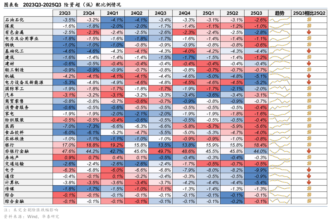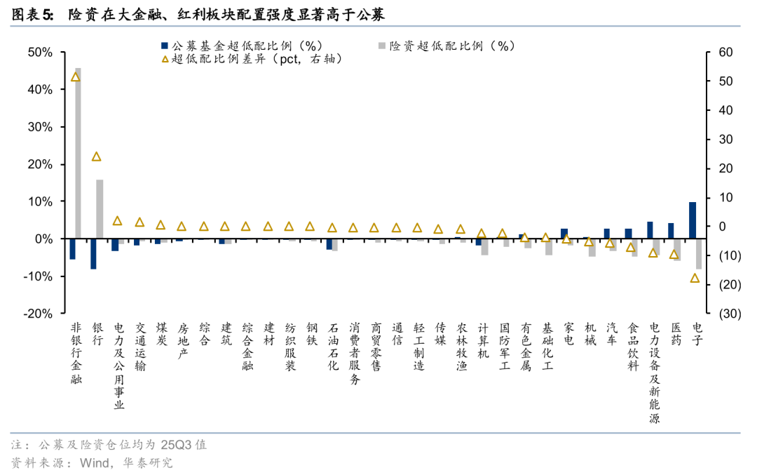 持仓结构上,与公募基金相比,25Q3险资在大金融、红利资产的配置强度相对较高,而在电子、医药、电力设备与新能源、食品饮料方面的配置强度相对较低。