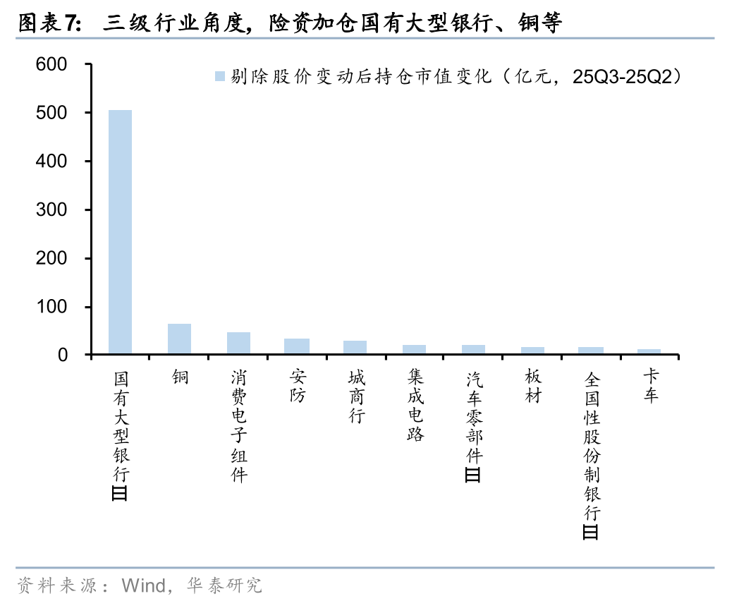 整体来看,险资加仓仍呈现“哑铃型”配置,但两侧结构有所调整。结合持股数量及超(低)配比例,进一步剔除涨跌幅来看,一级行业中,险资在25Q3主要加仓银行、综合金融、电子、汽车等方向,减仓通信、交通运输、传媒等;三级行业中,25Q3险资主要加仓国有大型银行、铜、消费电子组件、安防、城商行等,主要减仓风电、黄金、公路、铝、网络接配及塔设等方向。