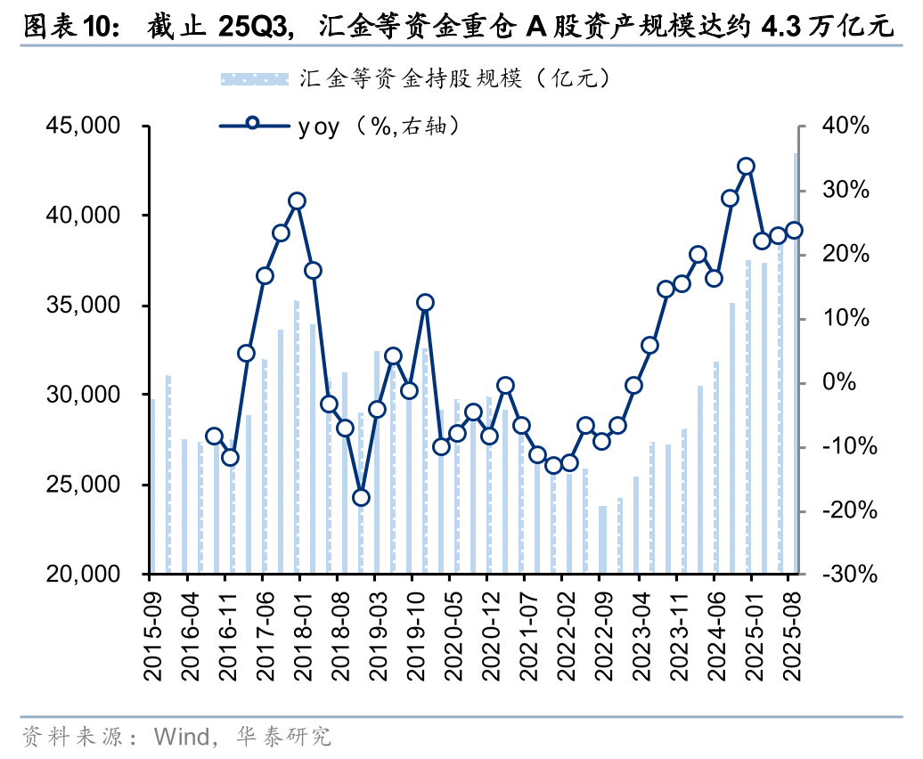 规模:25Q3,汇金等持股市值占全A自由流通市值的比重回落至8.8%;