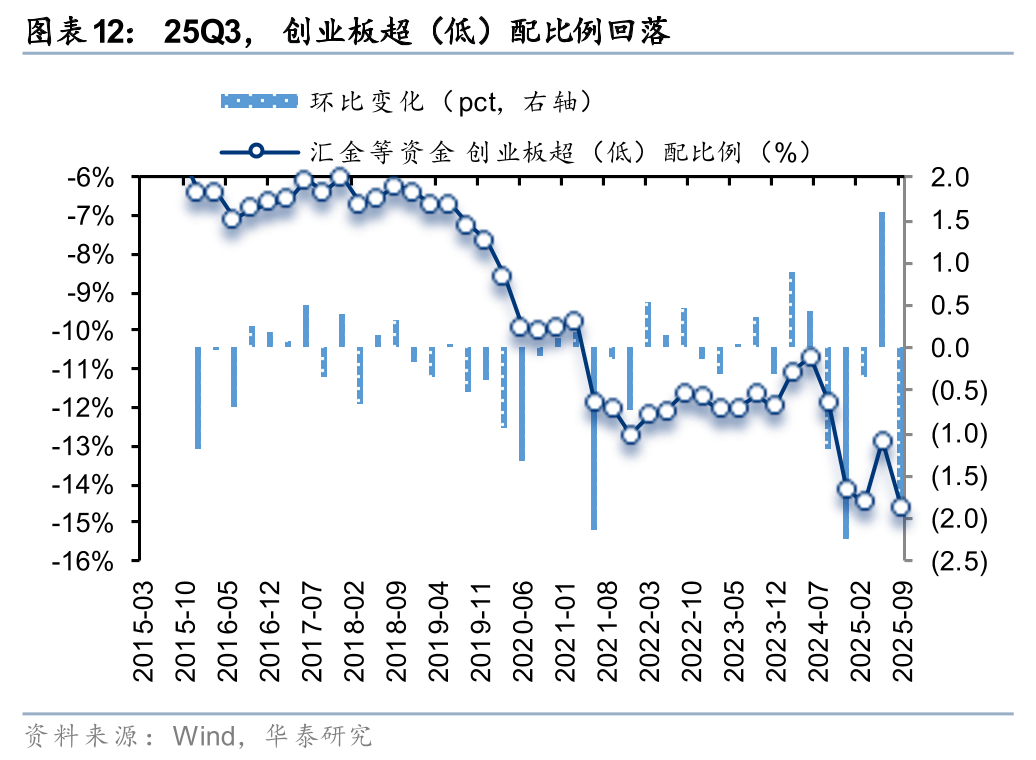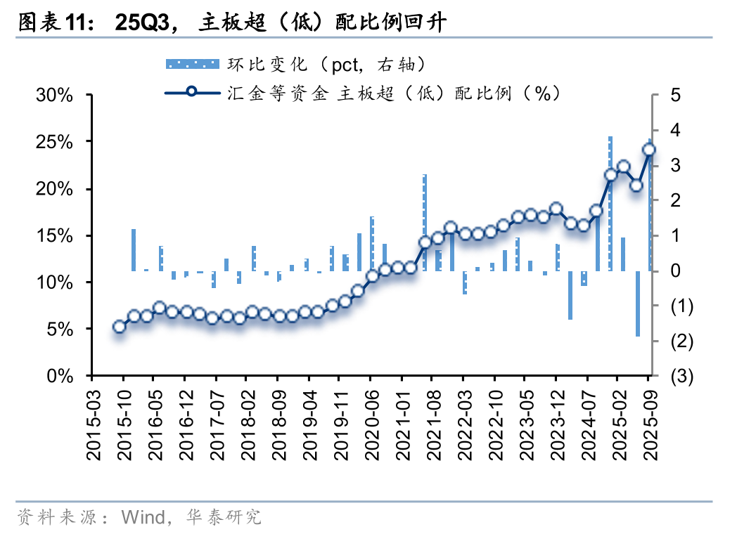 25Q3,汇金等资金对主板超(低)配比例回升,对创业板、科创板超(低)配比例回落。25Q3,汇金等资金对主板、创业板、科创板的超(低)配比例分别为24.1%、-14.6%、-8.9%,环比变化3.76pct、-1.75pct、-2.07pct,分别位于自2015年以来100.0%、0.0%、0.0%分位数。