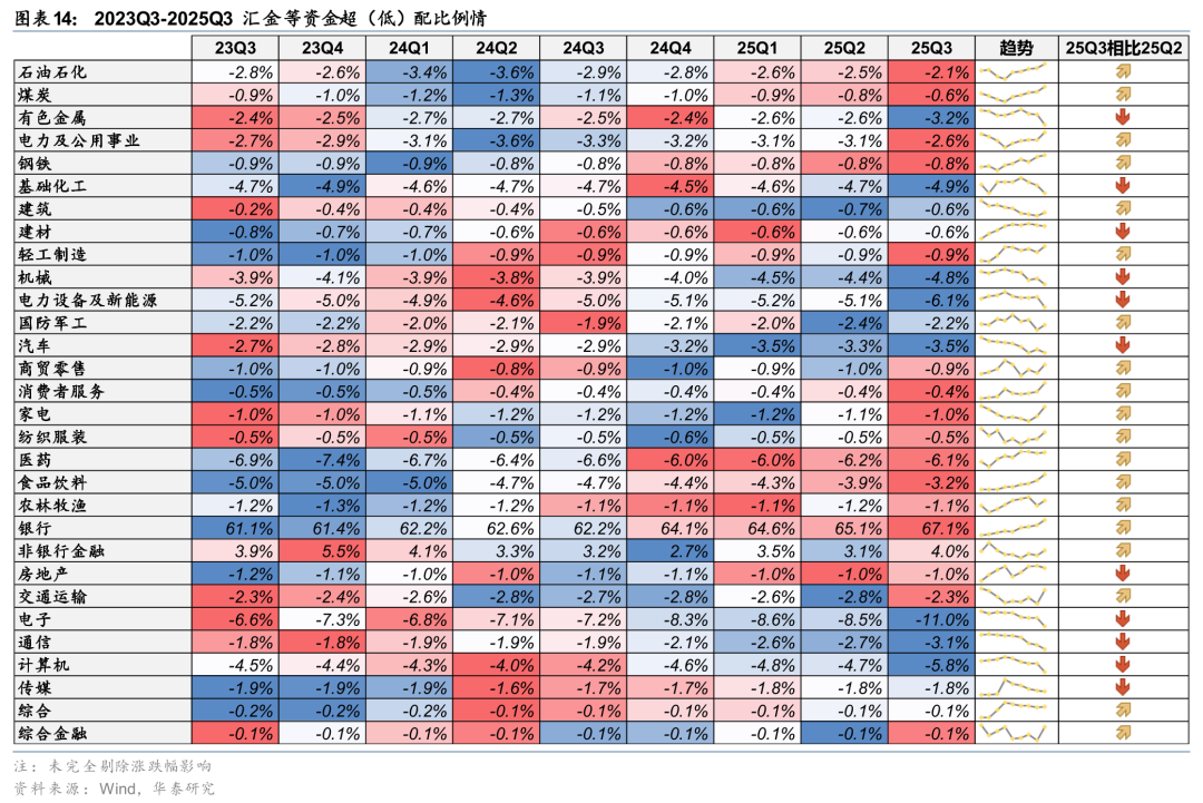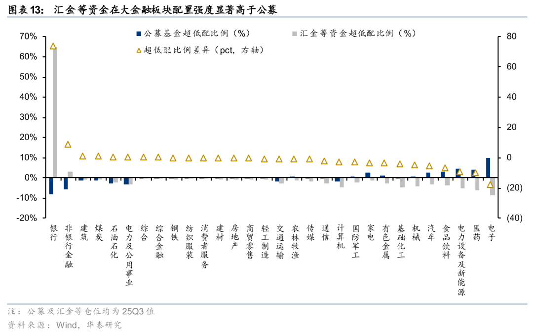 持仓结构上,与公募基金相比,25Q3汇金等资金在银行、非银行金融、建筑板块的配置强度相对较高,而在电子、医药、电力设备及新能源等板块的配置强度相对较低。