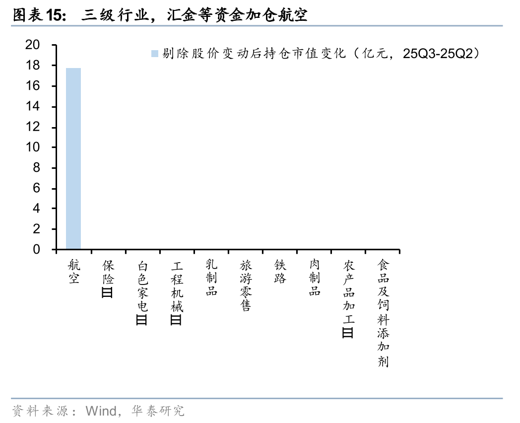 结合持股数量及超(低)配比例,进一步剔除涨跌幅来看,一级行业中,汇金等资金25Q3或主要加仓交通运输行业,减仓非银行金融、机械、电力设备及新能源;三级行业中,25Q3汇金等资金主要加仓航空等,减仓证券、船舶制造、基建建设、氯碱等。