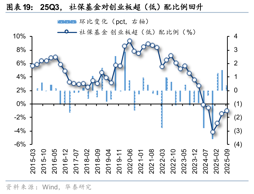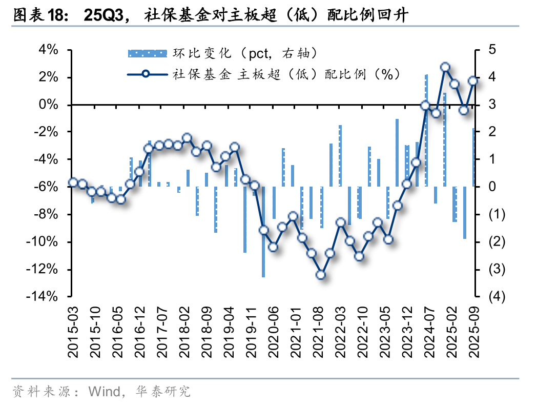 25Q3,社保基金对主板、创业板超(低)配比例回升,科创板超(低)配比例回落。25Q3,社保基金对主板、创业板、科创板的超(低)配比例分别为1.72%、-1.06%、-0.1%,环比变化2.2pct、0.4pct、-2.6pct,分别位于自2015年以来100%、0%、0%分位。