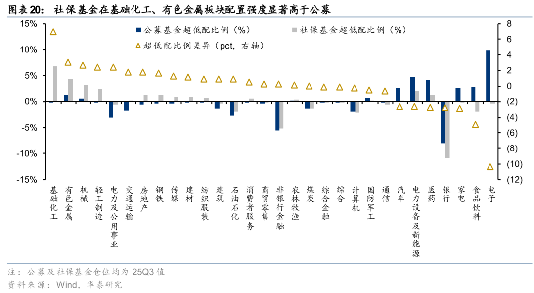 持仓结构上,与公募基金相比,25Q3社保基金在基础化工、有色金属、机械的配置强度相对较高,而在电子、食品饮料、家电等板块的配置强度相对较低。