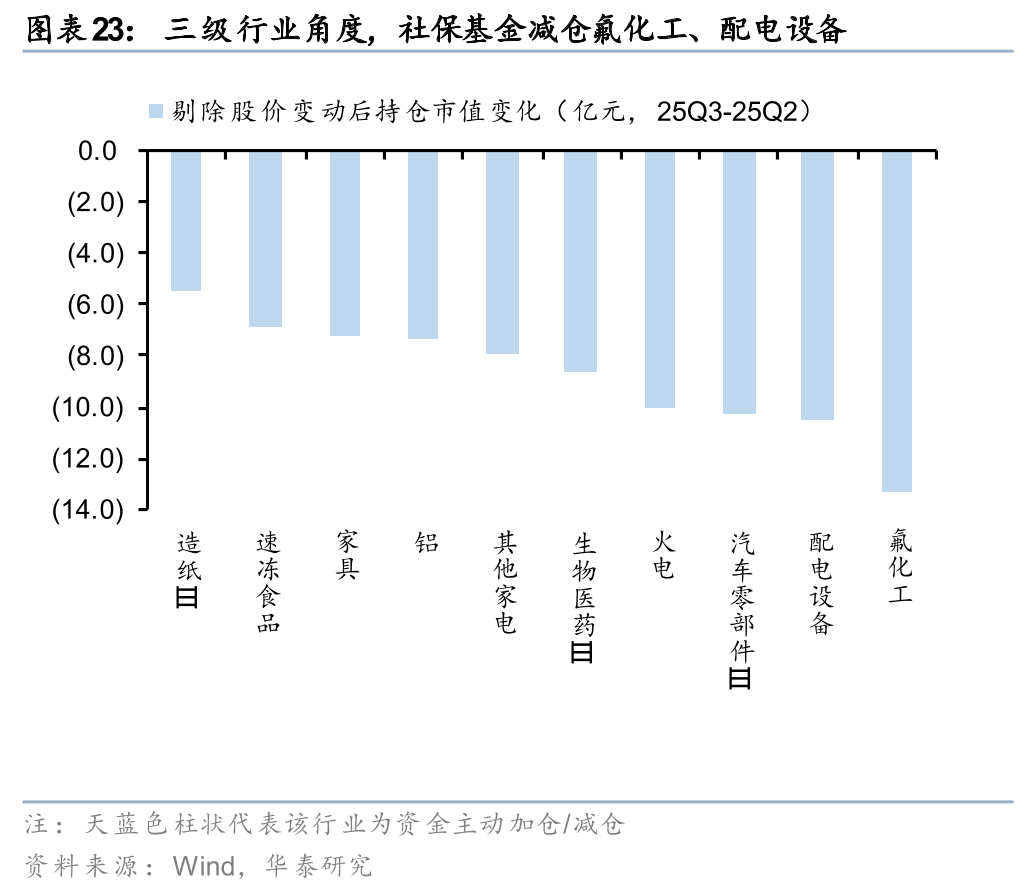 结合持股数量及超(低)配比例,进一步剔除涨跌幅来看,一级行业中,社保基金资金25Q3或主要加仓电子、汽车、传媒、计算机等行业;三级行业中,25Q3社保基金主要加仓乘用车、PCB、太阳能、白色家电、游戏,减仓氟化工、配电设备、汽车零部件、火电等。