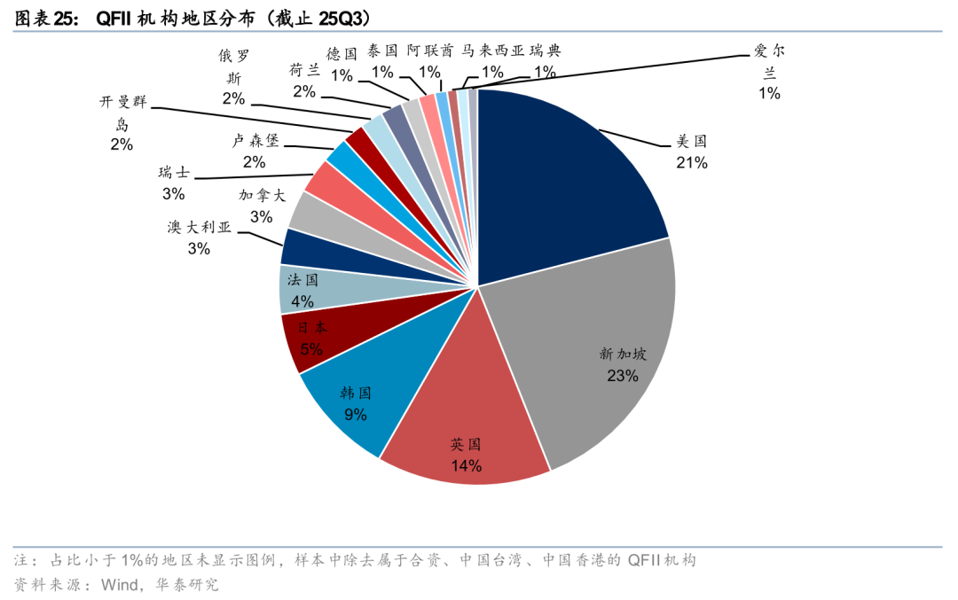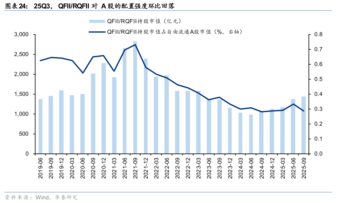 25Q3,QFII/RQFII对A股的配置强度小幅回落。2025Q3,QFII/RQFII以前十大股东计算的持股市值环比小幅回升至1436亿元,QFII/RQFII持股市值占全A流通市值的比重小幅回落至25Q3的0.29%,处于自2019年以来的8%的历史低位水平。