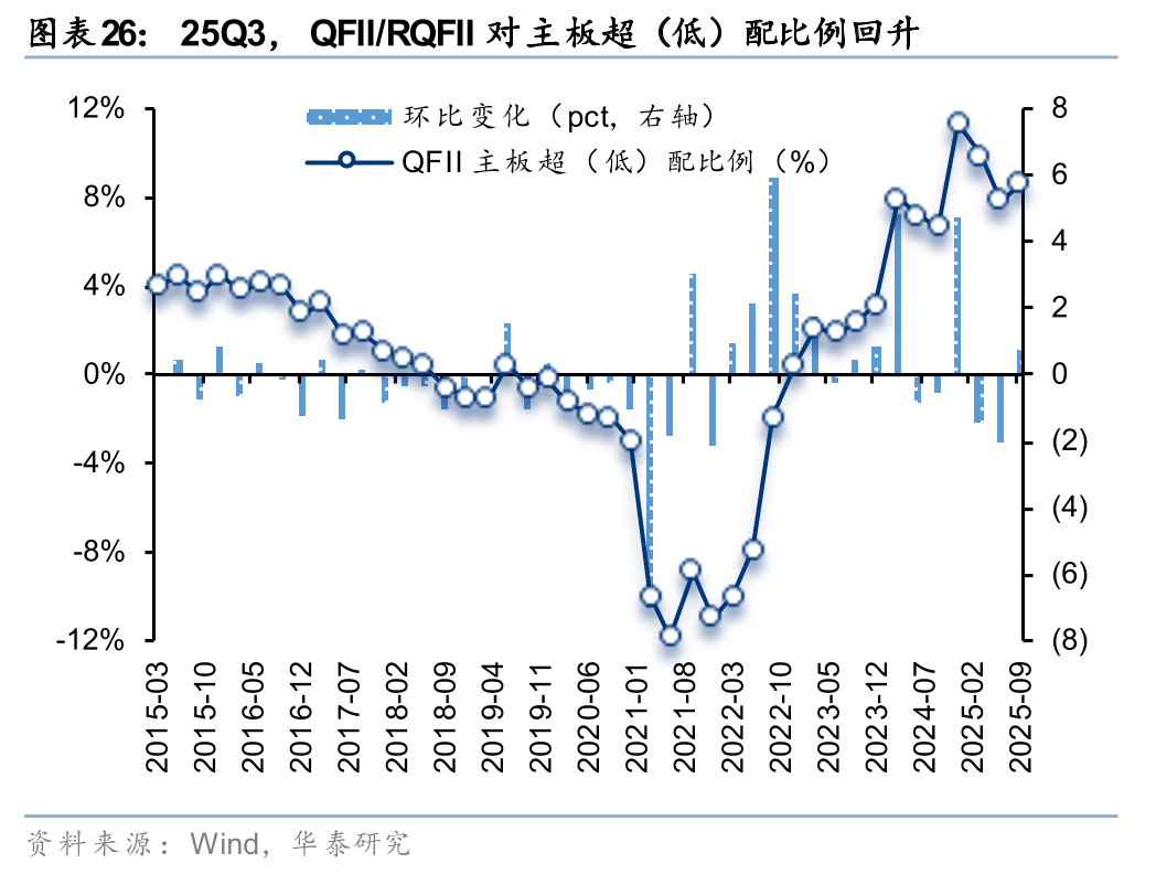 25Q3,QFII/RQFII对主板超(低)配比例回升,对科创板、创业板超(低)配比例回落。25Q3,QFII/RQFII对主板、创业板、科创板的超(低)配比例分别为8.64%、-2.79%、-5.29%,环比变化0.75pct、-0.22pct、-0.59pct,分别位于自2015年以来92.6%、34.1%、4.3%分位数。