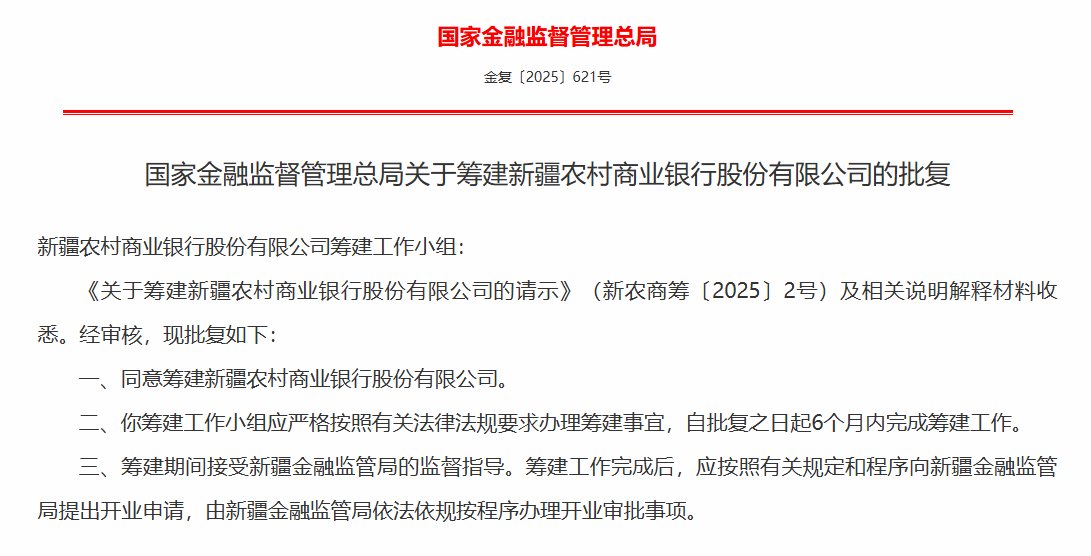 日前,国家金融监督管理总局发布批复,同意筹建新疆农村商业银行股份有限公司。批复指出,筹建工作小组应严格按照有关法律法规要求办理筹建事宜,自批复之日起6个月内完成筹建工作。筹建期间接受新疆金融监管局的监督指导。筹建工作完成后,应按照有关规定和程序向新疆金融监管局提出开业申请,由新疆金融监管局依法依规按程序办理开业审批事项。