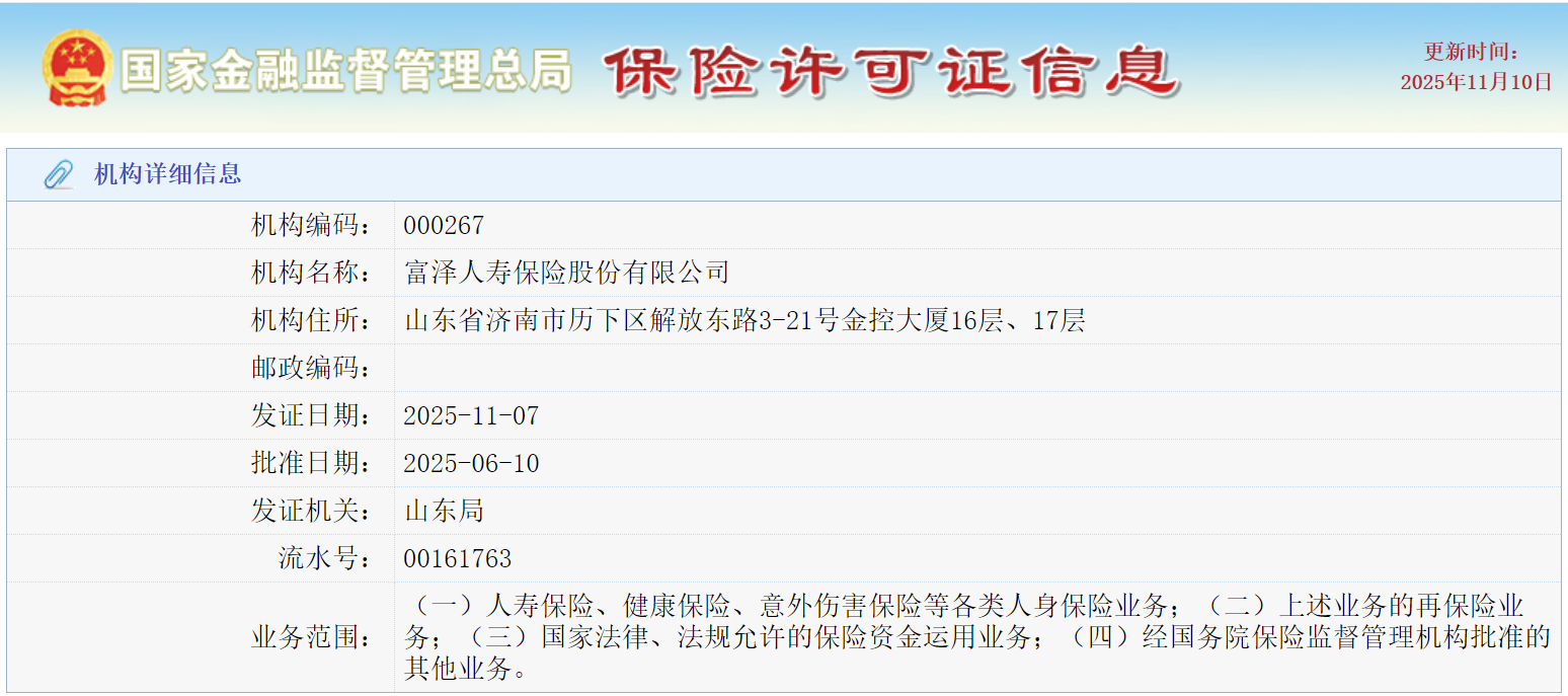 11月10日,金融监管总局官网发布的信息显示,富泽人寿保险股份有限公司(以下简称“富泽人寿”)近日获得保险许可证。