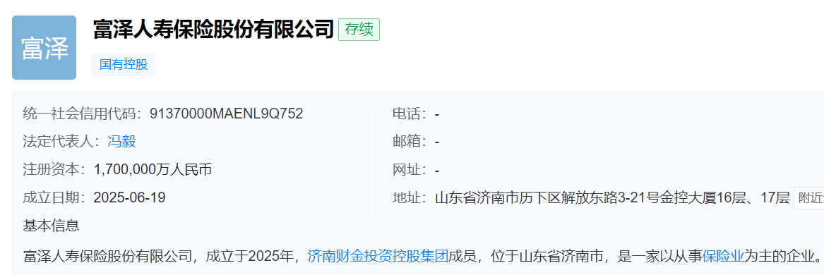据了解,富泽人寿注册资本达170亿元,股东包括济南金投控股集团有限公司、中国保险保障基金有限责任公司、中国人保资产管理有限公司、济南政金通达投资集团有限公司。