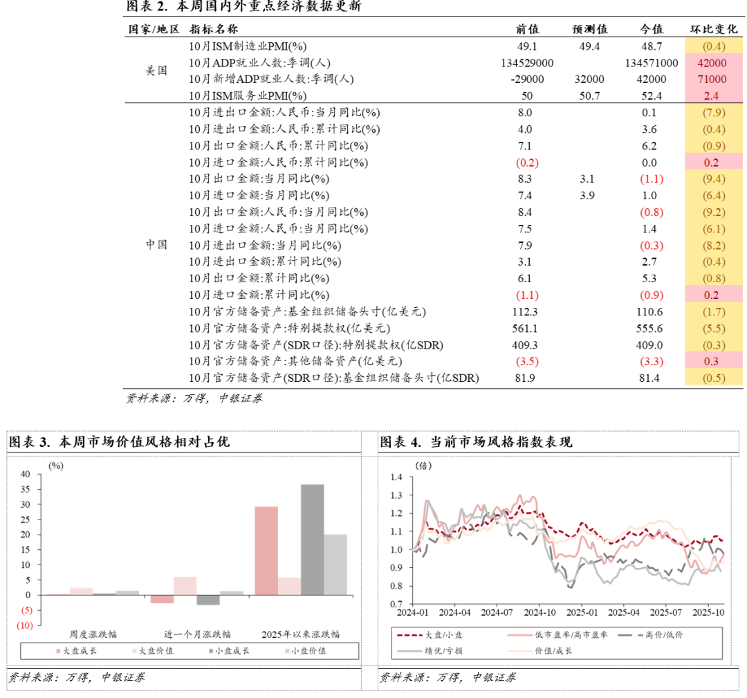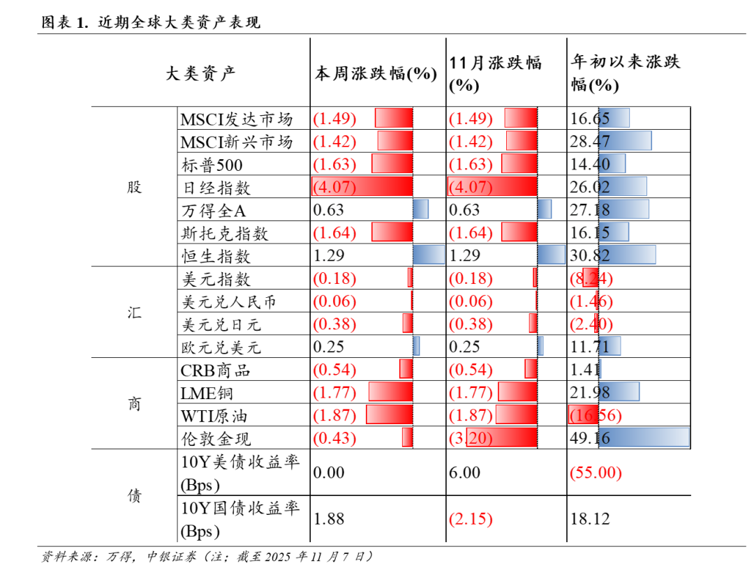 中国资产体现相对优势。本周海外风险资产出现普遍调整:美政府停摆时间创历史最长纪录,导致关键经济数据缺失,并严重打击了消费者信心和金融市场运营,11月密歇根大学消费者信心指数降至2022年6月以来最低。与此同时,A股港股表现出相对优势,内外增量资金先后接力,中国资产估值重塑行情正在开启。这与我们在《美元拐点:全球资产再平衡与中国科技重估》中的观点一致:弱美元环境下,A 股、港股为代表的中国资产有望成为本轮全球资产再平衡过程中的核心受益资产。