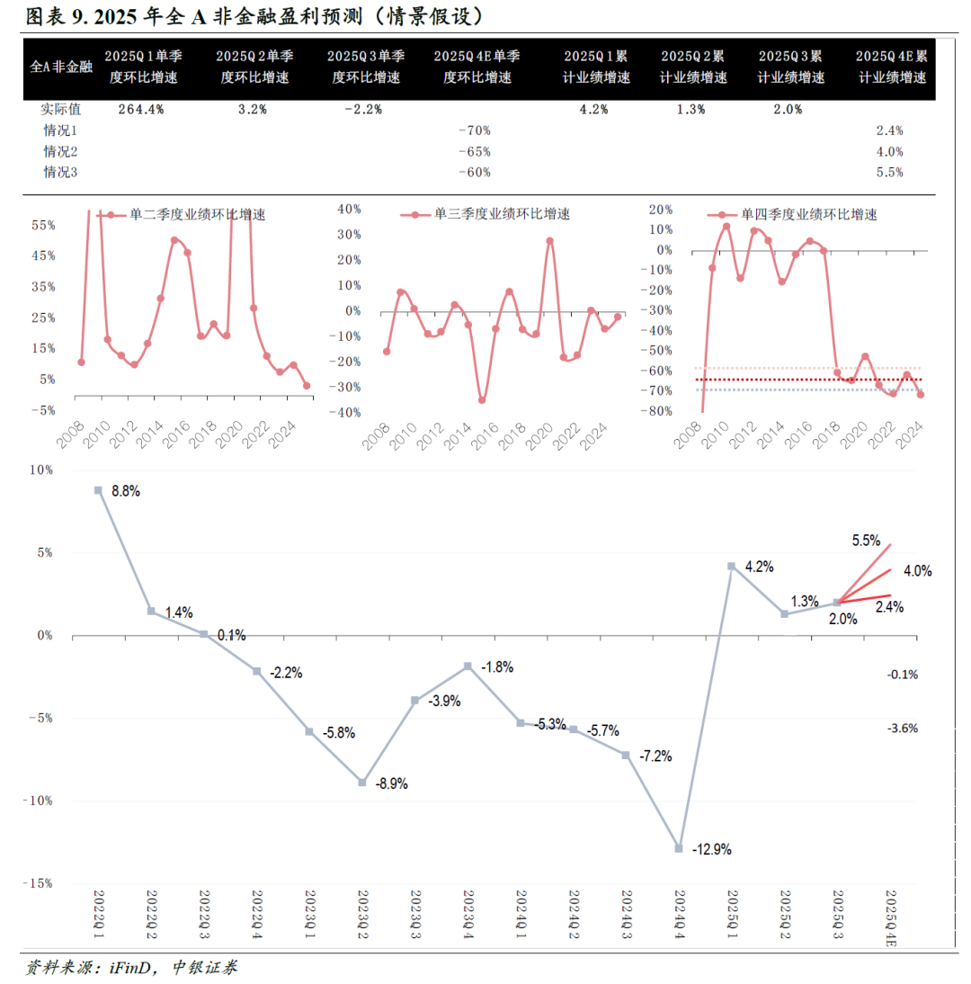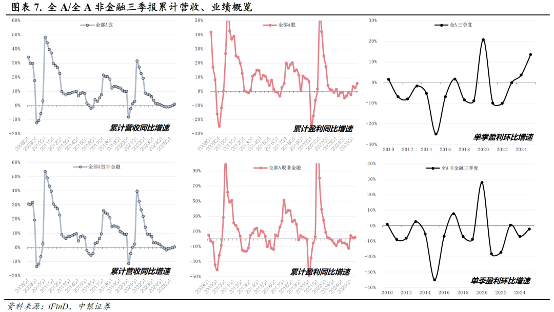 A股盈利持续改善。全部A股/非金融/非金融非石油石化2025Q3累计归母净利润(以下简称业绩或盈利)同比增速分别为5.6%/2.0%/4.0%,较中报(2.7%/1.3%/3.9%)变动2.9/0.7/0.1Pct。