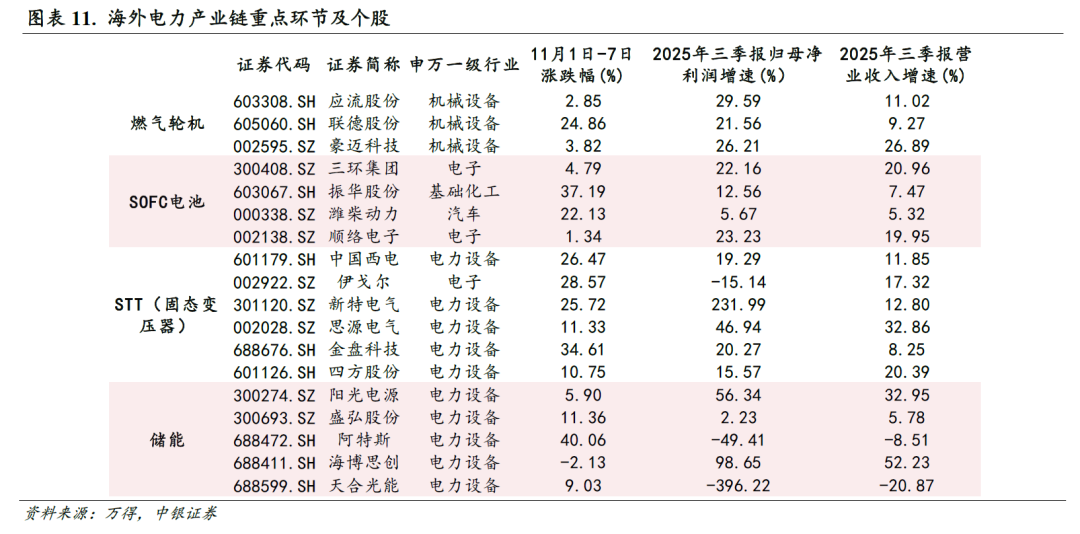 在此趋势之下,关注海外电力产业链重点环节,包括燃气轮机、SOFC电池、STT(固态变压器)、储能等。