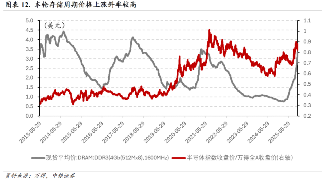 存储周期价格上涨斜率较高,后续或仍有较大上行空间。另一方面,存储芯片的高需求、涨价趋势进一步验证了AI算力需求的高景气,本轮存储周期之中,存储芯片价格涨幅和斜率均较高,特别是进入10月以来,AI存储芯片涨价趋势愈加强化。从DRAM价格周期来看,截至2025年11月初,存储价格已处于2013年以来的历史较高水平,但从当前涨价趋势以及AI产业浪潮带来的大量需求来看,本轮存储价格上行可能仍有较大空间。而从当前半导体板块市场表现来看,特别是类比上一轮周期相对高点,行情可能也仍有一定上行空间。