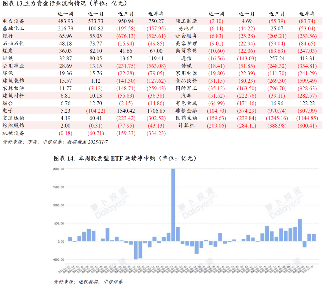 本周A股市场主力资金净买入238.35亿元,环比由净卖出转净买入。具体行业上,本周最受市场资金青睐的行业是电力设备,资金净流入规模达483.93亿元;基础化工、银行分列二、三,资金净流入规模分别是216.79亿元和65.96亿元;资金净流出规模最大的三个行业是计算机、医药生物和非银金融。本周股票型ETF场内净申购金额197.34亿元,为连续第2周净申购,环比减少10亿元。具体产品上,份额增加最多的五只ETF分别是国泰中证全指证券公司ETF、华泰柏瑞南方东英恒生科技指数ETF(QDII)、华夏恒生科技ETF(QDII)、广发中证香港创新药ETF(QDII)、汇添富国证港股通创新药ETF;减少最多的五只ETF分别是华泰柏瑞沪深300ETF、华夏上证50ETF、南方中证500ETF、华夏上证科创板50成份ETF、易方达沪深300ETF,集中在核心指数。