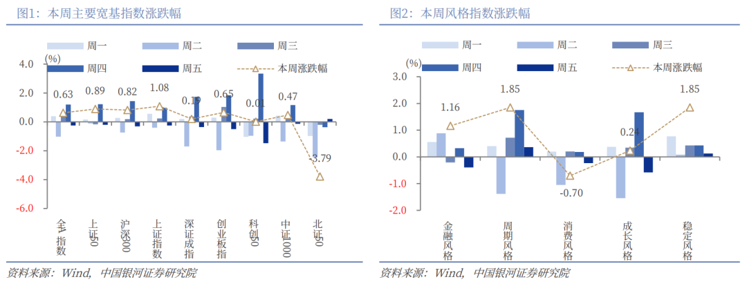 从风格来看,本周大盘风格相对占优,沪深300(0.82%)表现优于中证1000(0.47%);周期风格和稳定风格涨幅领先,为1.85%,金融风格和成长风格也录得上涨,而消费风格下跌0.70%。