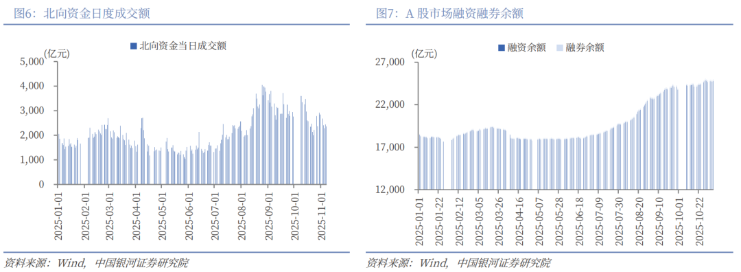 本周北向资金日均成交额为2434.79亿元,较上周的日均成交额下降293.83亿元。截至11月6日(周四),本周融资和融券余额均上升。两融余额为24988.42亿元,较上周上升125.64亿元。其中,融资余额为24805.37亿元,上升117.45亿元;融券余额为183.05亿元,上升8.19亿元。