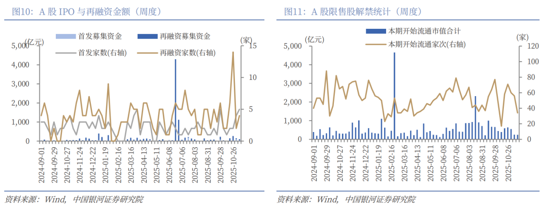 下周市场资金流出压力将较本周下降。本周共有56家公司限售股陆续解禁,合计解禁11.64亿股,解禁总市值249.33亿元;下周(11月10日-11月16日)预计共有34家公司限售股陆续解禁,合计解禁14.07亿股,按11月7日收盘价计算,解禁总市值约为247.33亿元。