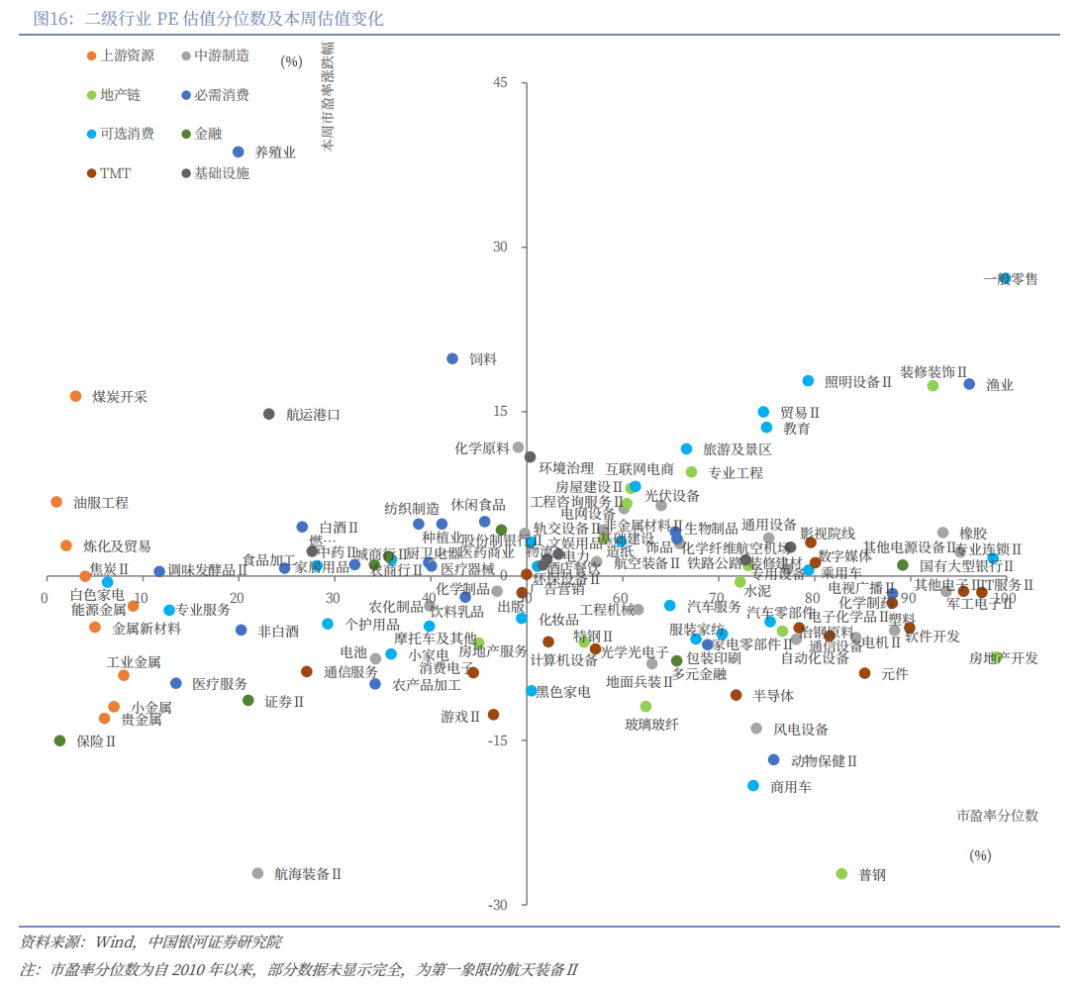 二级行业表现来看,本周收益率前五的行业依次是电网设备、装修装饰Ⅱ、贸易Ⅱ、焦炭Ⅱ、光伏设备;收益率靠后的行业依次是医疗服务、化学制药、软件开发、小家电、互联网电商。