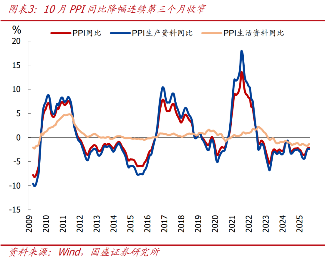 >PPI方面:10月PPI同比-2.1%,降幅较上月收窄0.2个百分点,为连续第三个月回升;环比上涨0.1%,为年内首度转正。归因看,10月PPI环比上涨、同比降幅收窄,主要有三点支撑:一是“反内卷”对价格的催化,煤炭、光伏价格已连续两个多月环比上涨,电池制造价格环比由跌转涨,汽车制造价格环比降幅也有所收窄;二是国际金价、铜价上涨,带动有色行业价格上涨;三是双节消费需求带动一般日用品价格上涨。此外,国际油价下行导致原油-石化产业链价格续跌。