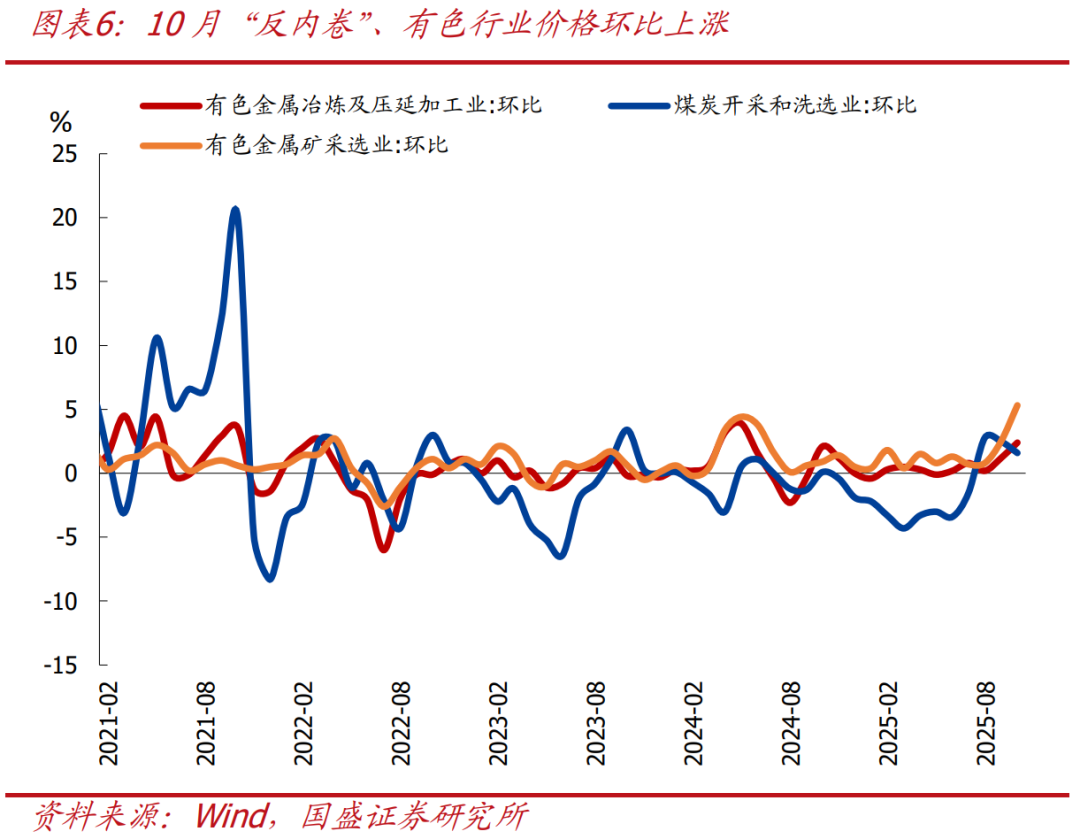 >PPI重点细分行业:10月细分行业价格半数回升,“反内卷”、有色行业和一般日用品行业是亮点,国际油价下行导致原油—石化产业链价格回落。具体看:1)“反内卷”行业:PPI煤炭开采、煤炭加工、光伏设备环比分别上涨1.6%、0.8%、0.6%,均连续两个多月上涨,PPI锂离子电池制造由下跌转为上涨0.2%,PPI汽车制造环比下跌0.2%,降幅较上月收窄0.3个百分点;2)有色:PPI有色采选、有色冶炼环比分别上涨5.3%、2.4%,同比涨幅分别扩大至18.9%、6.8%;3)一般日用品:PPI工艺美术用品、球类、营养食品及饮料同比分别上涨18.4%、3.3%、2.1%、0.4%;4)原油-石化产业链:受国际油价下跌影响,PPI油气开采、石油加工、化工、化纤环比分别下跌2.3%、0.5%、0.6%、0.7%。