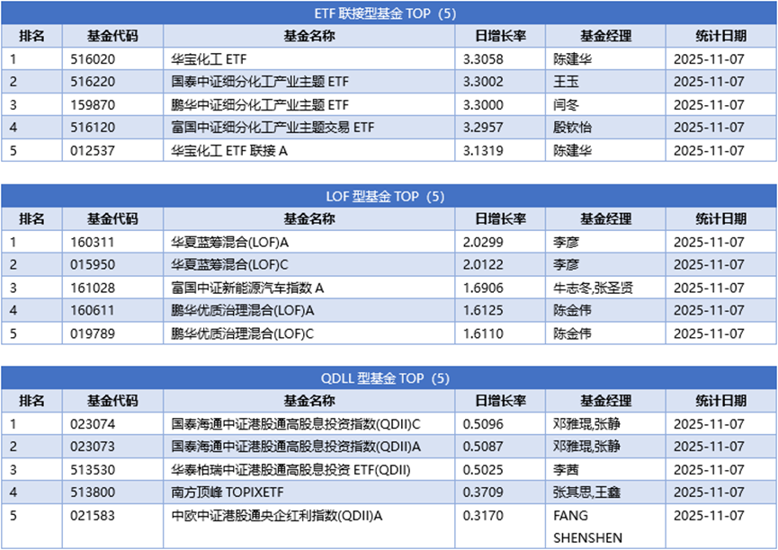 分投资类型看,同样剔除掉分级杠杆及固定收益两类基金的影响,股票型基金冠军为中欧中证细分化工产业主题指数A,日增长率为3.1838%;债券型基金冠军为前海开源可转债债券C,日增长率为1.0618%;混合型基金冠军为银河核心优势混合C,日增长率为4.7702%;货币型基金冠军为红土创新优淳货币A,日增长率为0.0295%;ETF联接基金冠军为华宝化工ETF,日增长率为3.3058%;LOF型基金冠军为华夏蓝筹混合(LOF)A,日增长率为2.0299%;QDII基金冠军为国泰海通中证港股通高股息投资指数(QDII)C,日增长率为0.5096%;下面是不同类型基金日增长率TOP5 (剔除掉分级基金的影响)