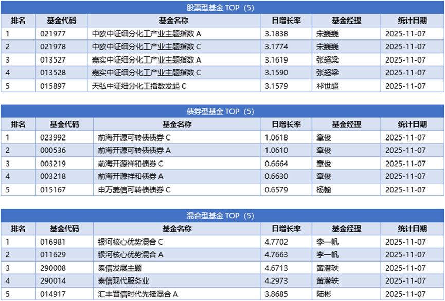 单基金方面,剔除掉 创新封基类型 基金的影响,11月07日业绩表现最好的基金为银河核心优势混合C,日增长率为4.7702%,其次为银河核心优势混合A,日增长率为4.7663%、泰信发展主题,日增长率为4.6713%。