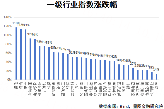 如果下沉至一级行业纬度,则不同一级行业之间的涨跌幅分野更加明显。从2024年9月24日开始,截止11月12日,涨幅排名前5位的通信、综合、电子、有色金属、电力设备等分别上涨117.52%、113.41%、112.85%、92.39%和90.98%;涨幅排名后5位的石油石化、交通运输、食品饮料、公用事业和煤炭等分别上涨21.89%、21.85%、21.44%、17.99%和13.86%。其中,偏差最大的通信与煤炭板块的涨跌幅差距高达103.66个百分点。