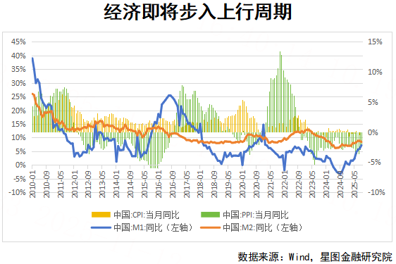 除此以外,“老登资产”往往与经济周期强相关,因此经济复苏前景的显著升温同样是重要支撑。,经济复苏进程可分为三个阶段:初期以政策落地和货币宽松为主,M1、M2同比率先回升;中期伴随需求改善,物价水平逐步企稳,CPI、PPI同比随之上升;最终在微观主体信心恢复推动下,投资与消费全面回暖,GDP等宏观指标重返高位。当前,M1、M2同比已经于2024年9月触底反弹,CPI、PPI同比于2025年7月也开始回升。刚刚公布的10月CPI、PPI同比分别录得0.20%、-2.10%,而PPI环比更是自2024年12月以来首次转正,我们可能正处于经济上行周期的门槛上,随着市场对价格回升与经济回暖的预期增强,与经济周期高度相关的“老登资产”因而迎来估值修复。