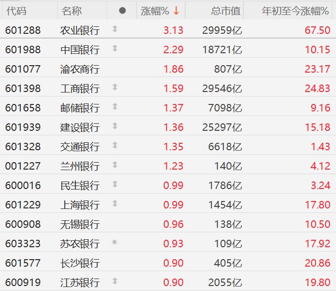 11月12日,A股市场银行股集体强势,截至半日收盘,农业银行涨超3%领涨板块,中国银行涨超2%,渝农商行、工商银行、邮储银行、建设银行、交通银行、兰州银行涨超1%。其中,农业银行和工商银行均再创历史新高。