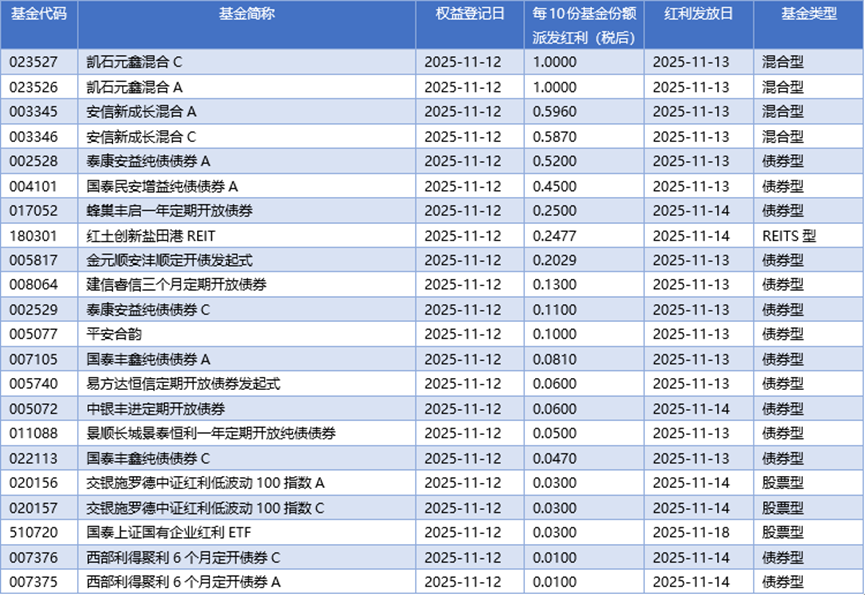 (1)11月12日新发基金共有12只,主要为股票型基金和混合型基金,其中国联价值均衡混合A募集目标金额达60.00亿元;基金分红22只,多为债券型,派发红利最多的基金是凯石元鑫混合型发起式证券投资基金,每10份基金份额派发红利1.0000元。