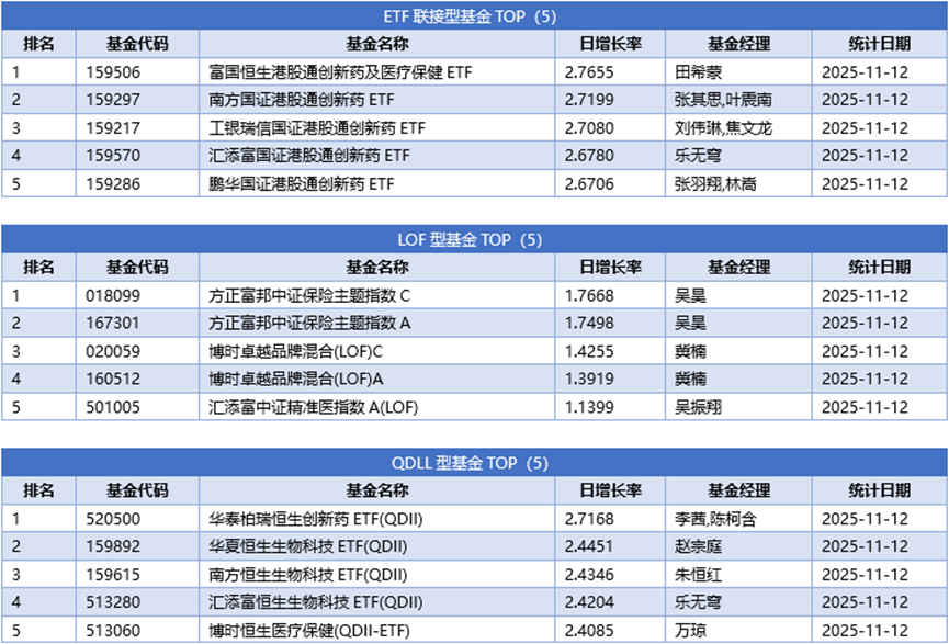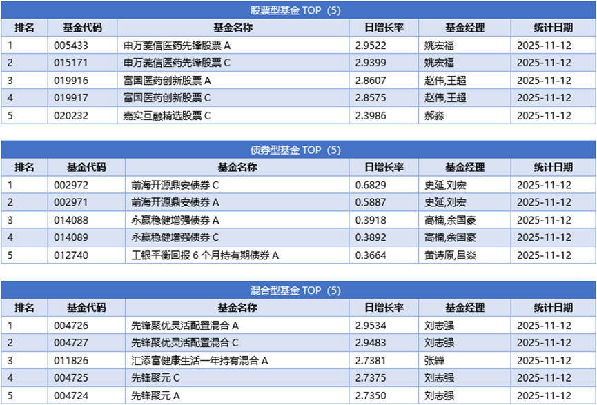 单基金方面,剔除掉 创新封基类型 基金的影响,11月12日业绩表现最好的基金为先锋聚优灵活配置混合A,日增长率为2.9534%,其次为申万菱信医药先锋股票A,日增长率为2.9522%、先锋聚优灵活配置混合C,日增长率为2.9483%。