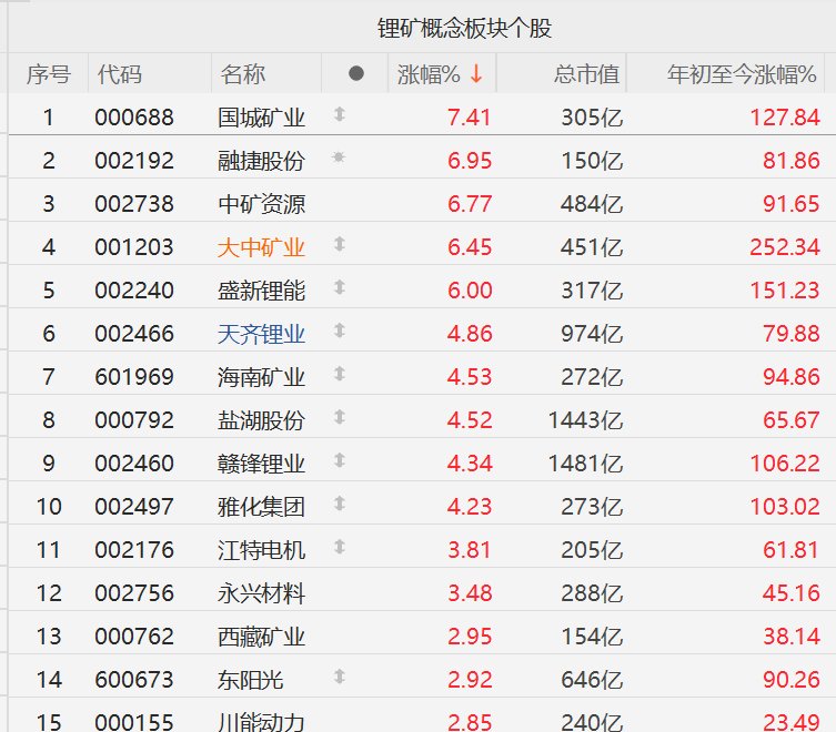 11月17日,碳酸锂主力合约涨超4%,带动A股锂矿股集体上涨,其中,国城矿业涨超7%,融捷股份、中矿资源、大中矿业、盛新锂能涨超6%,天齐锂业、海南矿业、盐湖股份、赣锋锂业、雅化集团涨超4%。