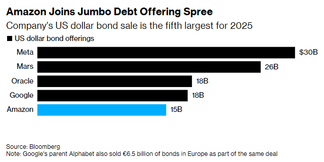 智通财经获悉,亚马逊(AMZN.US)近日启动了三年来的首次美元债券发行,募资150亿美元。眼下科技企业正争相为人工智能(AI)基础设施融资,掀起大额发债热潮,亚马逊此举进一步加入这一趋势。
