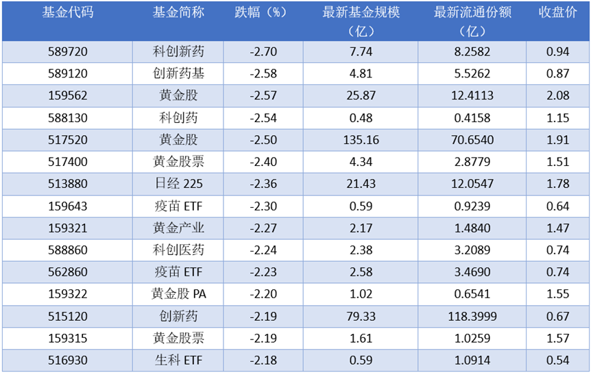 下跌方面,2025年11月17日跌幅最大的是科创新药(589720),跌幅达到2.70%。排名靠前的创新药基(589120)、黄金股(159562)、科创药 (588130),跌幅分别为2.58%、2.57%、2.54%。