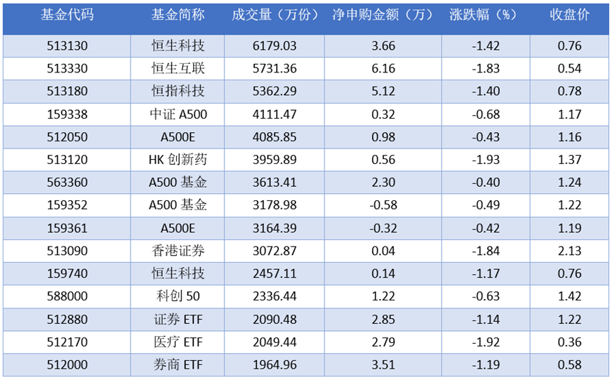 从成交量上来看,2025年11月17日成交量最大的是恒生科技(513130),成交量为6179.03万份。排名靠前的恒生互联(513330)、恒指科技(513180)、中证A500(159338),成交量分别为5731.36万份、5362.29万份、4111.47万份。