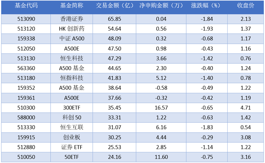 从成交金额上来看,2025年11月17日成交额最大的是香港证券(513090),交易金额65.85亿元。排名靠前的HK创新药(513120)、中证A500(159338)、A500E (512050),成交额分别为54.64亿元、48.09亿元、47.50亿元。