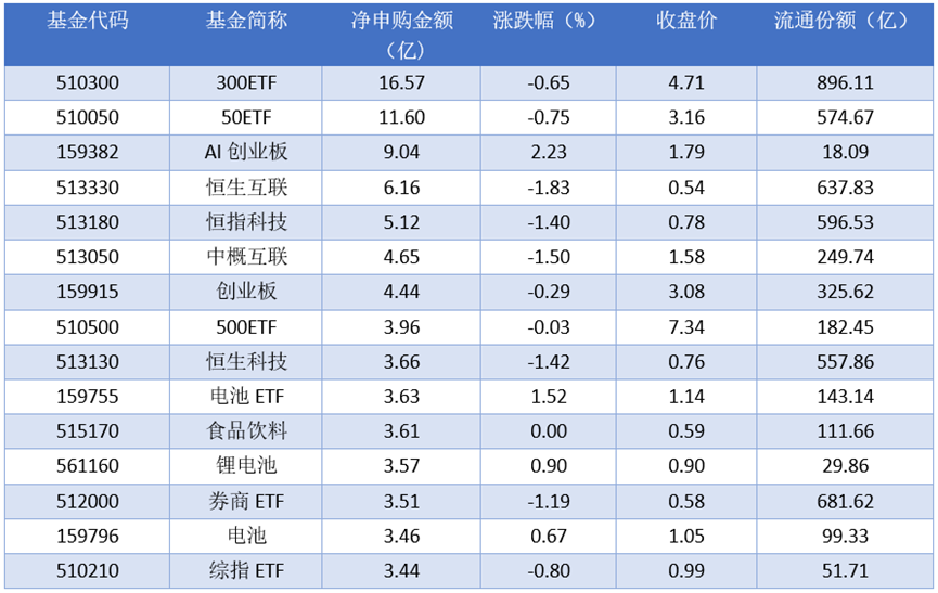 细分到资金流动情况上来看,2025年11月17日净申购金额最大的为300ETF (510300),当日净申购金额为16.57亿元。排名靠前的50ETF (510050)、AI创业板(159382)、恒生互联(513330),申购金额为11.60亿元、9.04亿元、6.16亿元。