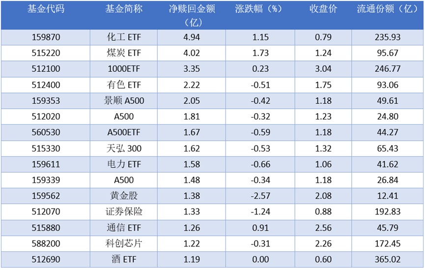 资金流出方面,2025年11月17日净赎回金额最多的是化工ETF(159870),赎回金额4.94亿元。排名靠前的煤炭ETF (515220)、1000ETF (512100)、有色ETF (512400),赎回金额分别为4.02亿元、3.35亿元、2.22亿元。