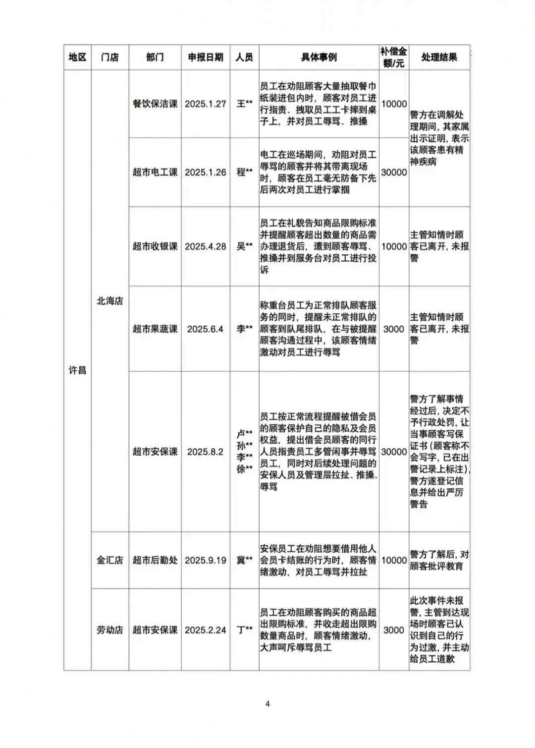 ,《胖东来侵犯人格尊严的补偿标准》部分截图,记者梳理发现,33个案例当中,有员工最多被补偿3万元,最少的也有3000元。这些员工大多是在工作当中被顾客掌掴、辱骂、推搡,处理结果根据实际情况有所不同,有的在警方介入后和解,有的当事人则被行政拘留。,其中一则案例写道:2025年1月26日,许昌北海店,超市电工程某某在巡场期间,劝阻对员工辱骂的顾客并将其带离现场时,顾客在员工毫无防备下先后两次对员工进行掌掴,警方在调解处理期间,其家属出示证明,表示该顾客患有精神疾病。随后,胖东来补偿该员工30000元。,