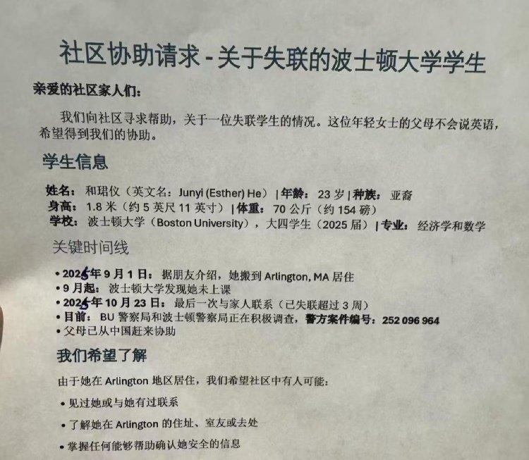 ,据寻人启事,23岁亚裔女性和珺仪为波士顿大学学生,专业为经济学和数学,身高1米8,体重70公斤。2025年9月1日,据朋友介绍,和珺仪搬到马萨诸塞州的阿灵顿居住。9月起,波士顿大学发现她未到校上课,10月23日为她与家人的最后一次联系,目前已失联超3周。BU警察局和波士顿警察局正在积极调查。和珺仪的父母已从中国赶至美国。,
