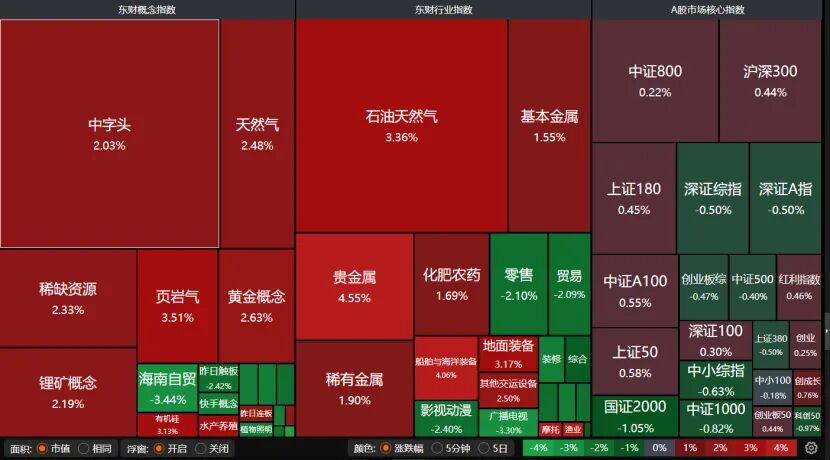 盘面上,中字头、天然气、稀缺资源、锂矿概念、有机硅、黄金概念大涨,但零售、贸易、影视动漫、广播电视等概念跌幅较大。