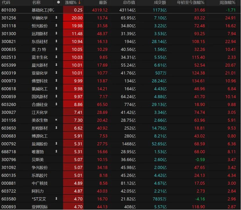 华融化学、恒光股份“20cm”涨停,远翔新材、东岳硅材涨幅超过10%,英力特、蓝丰生化、晨光新材、亚星化学、氯碱化工、国风新材涨停。