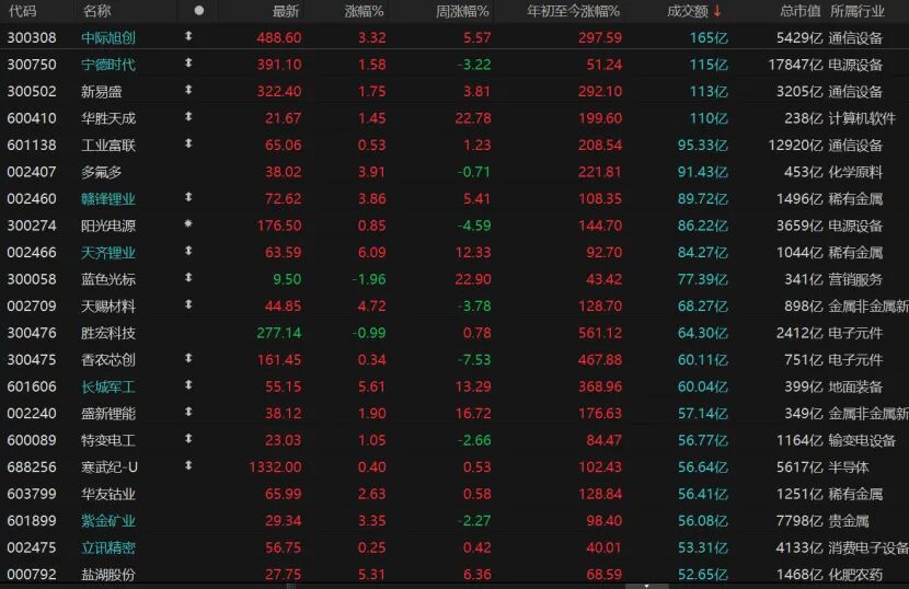 市场仅有1200只个股收涨,涨停股64只;4175只个股收跌,跌停股33只。日成交额靠前的个股收涨居多。仅有4只个股日成交额超过100亿元,中际旭创收涨3.32%报488.6元/股,宁德时代收涨1.58%报391.1元/股,新易盛涨近2%,华胜天成收涨1.45%报21.67元/股。多氟多、赣锋锂业均涨近4%。