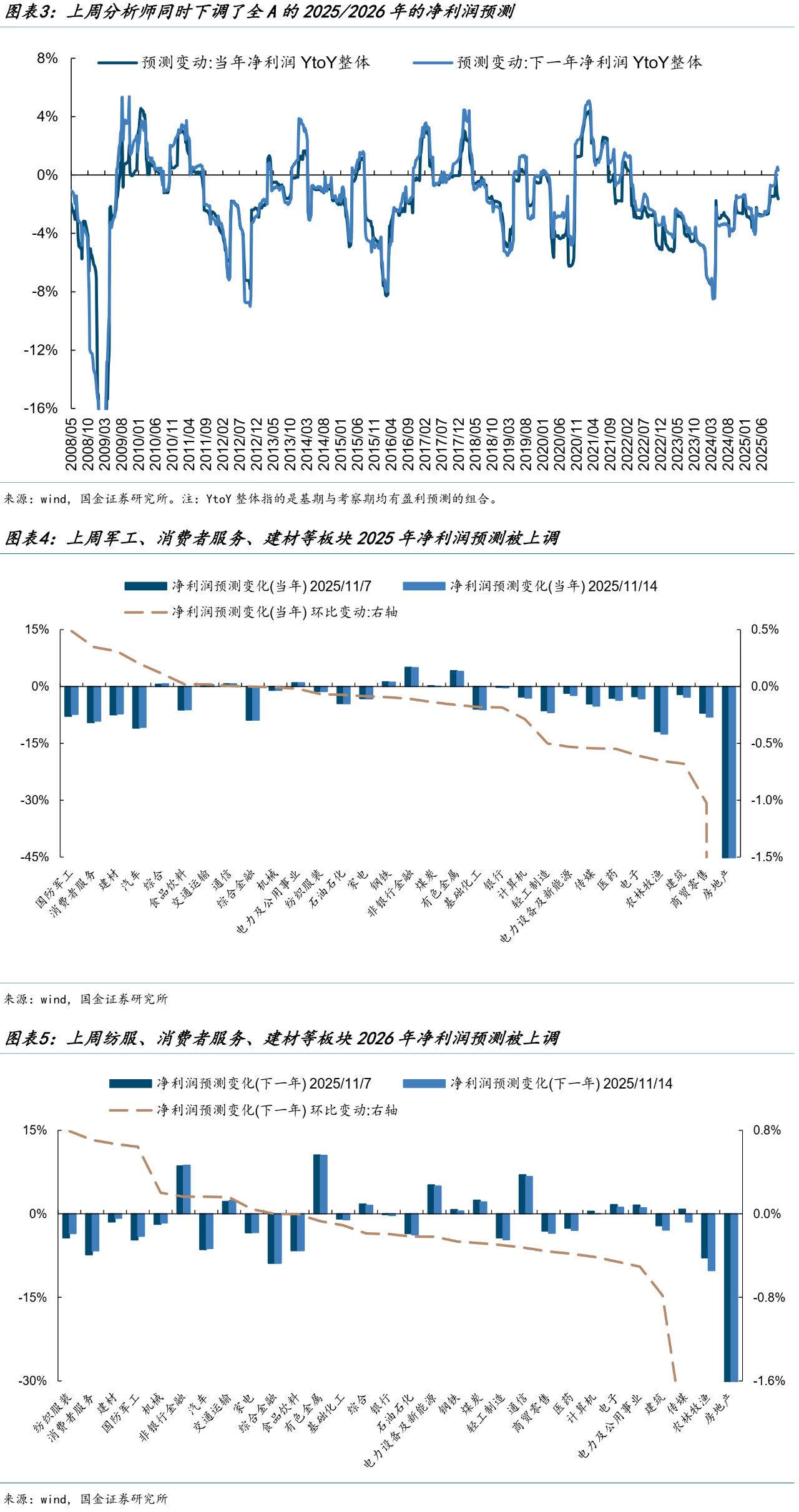 盈利预测:全A的25/26年净利润预测同时被下调。行业上,军工、消费者服务、建材、汽车、交运等板块25/26年净利润预测均被上调。