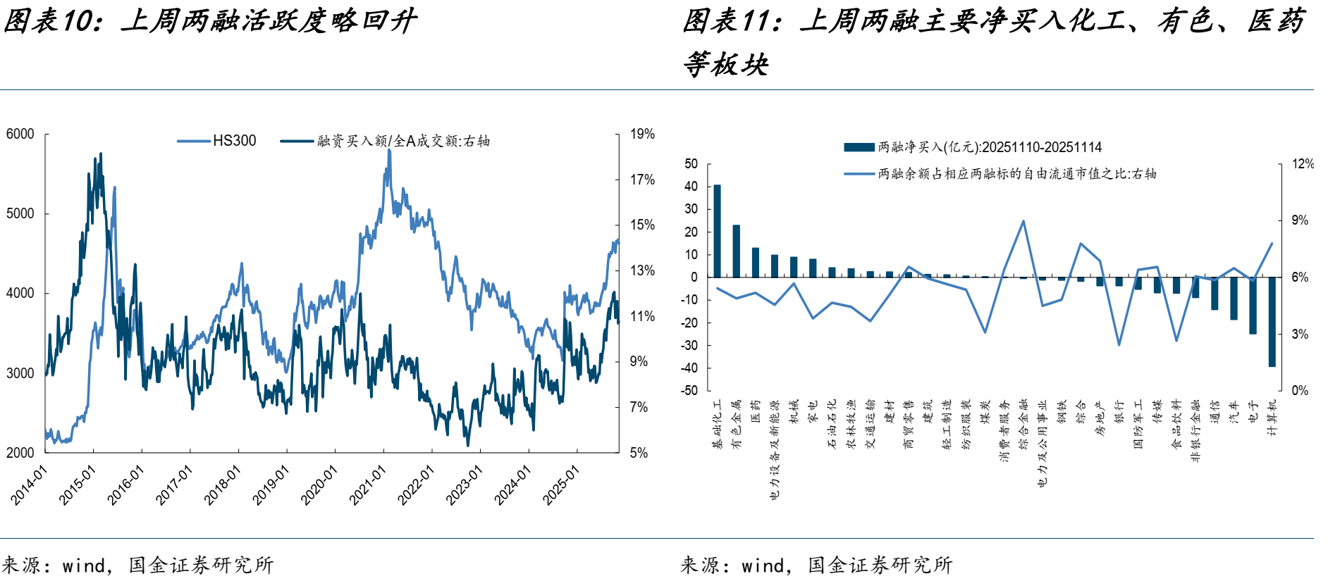 两融活跃度略回升,但仍处于阶段低位。行业上,两融主要净买入化工、有色、医药等板块,净卖出计算机、电子、汽车等板块。