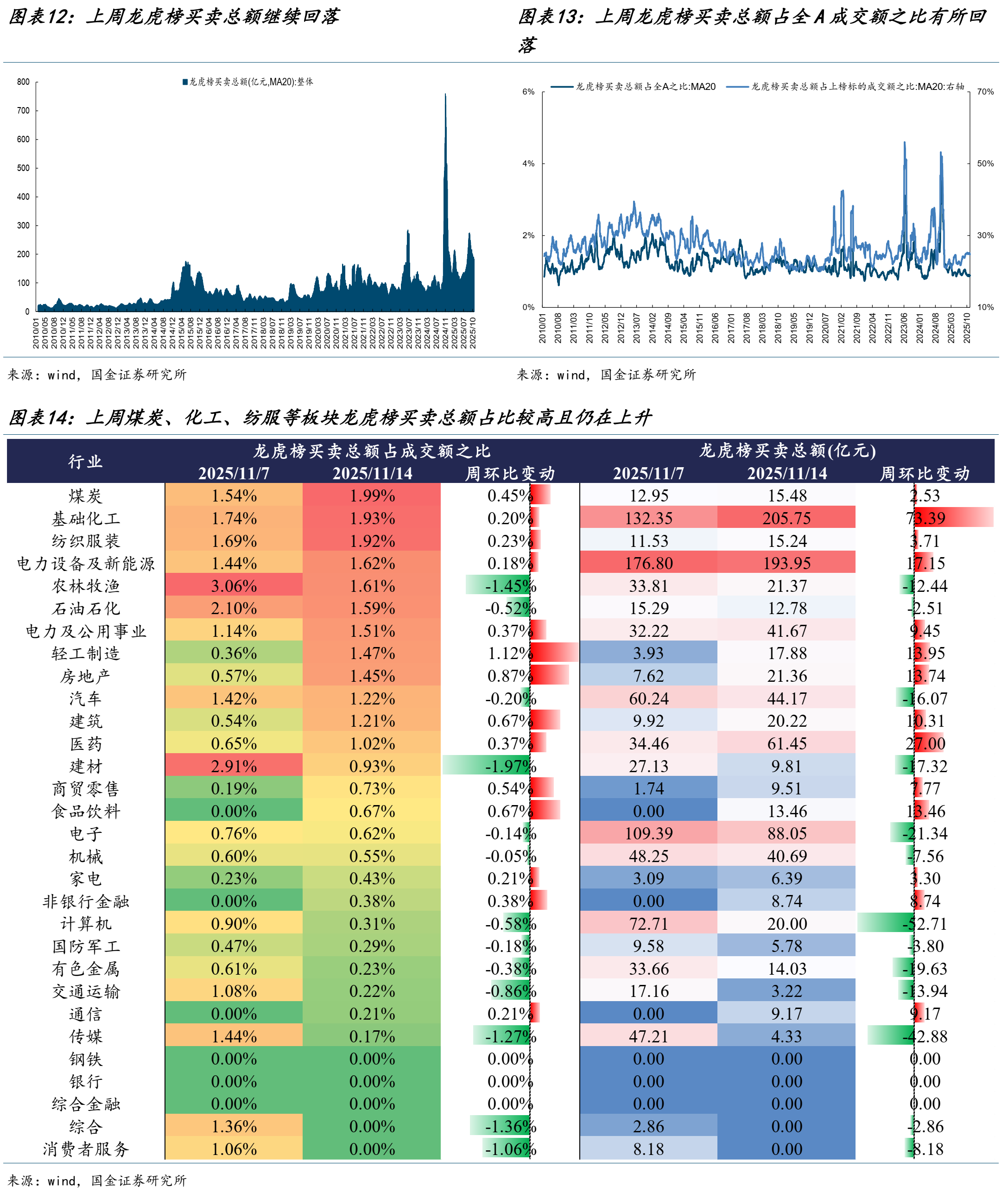 龙虎榜交易热度继续回落,煤炭、化工、纺服等板块的龙虎榜买卖总额占成交额之比相对较高且仍在上升。