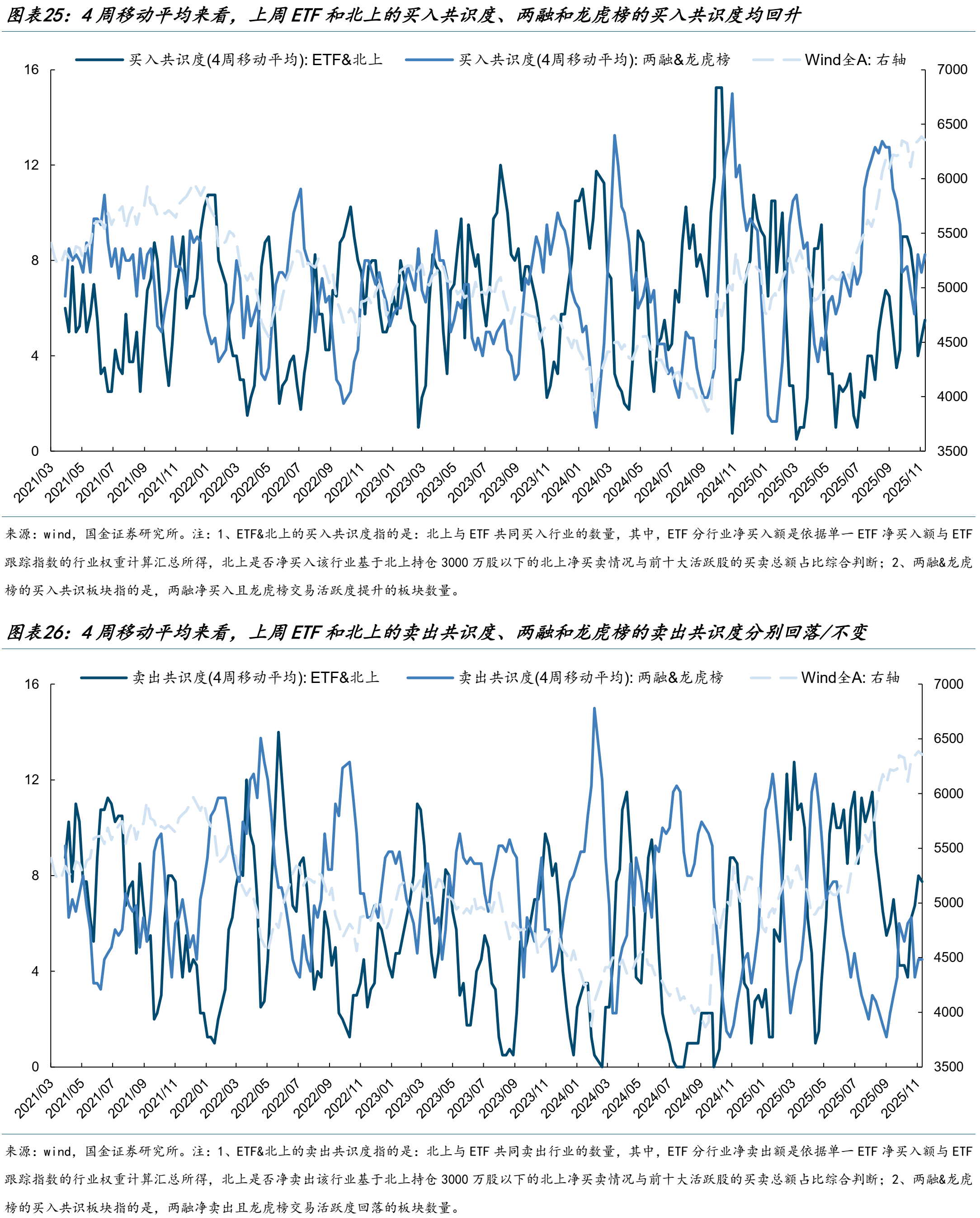参与者共识高频跟踪:ETF和北上的买入共识度、两融和龙虎榜的买入共识度均有所回升。这意味着个人ETF依然是阶段主要增量资金之一,而两融转为净流出,其他投资者则大多继续净卖出,后续仍需关注交易层面的扰动。